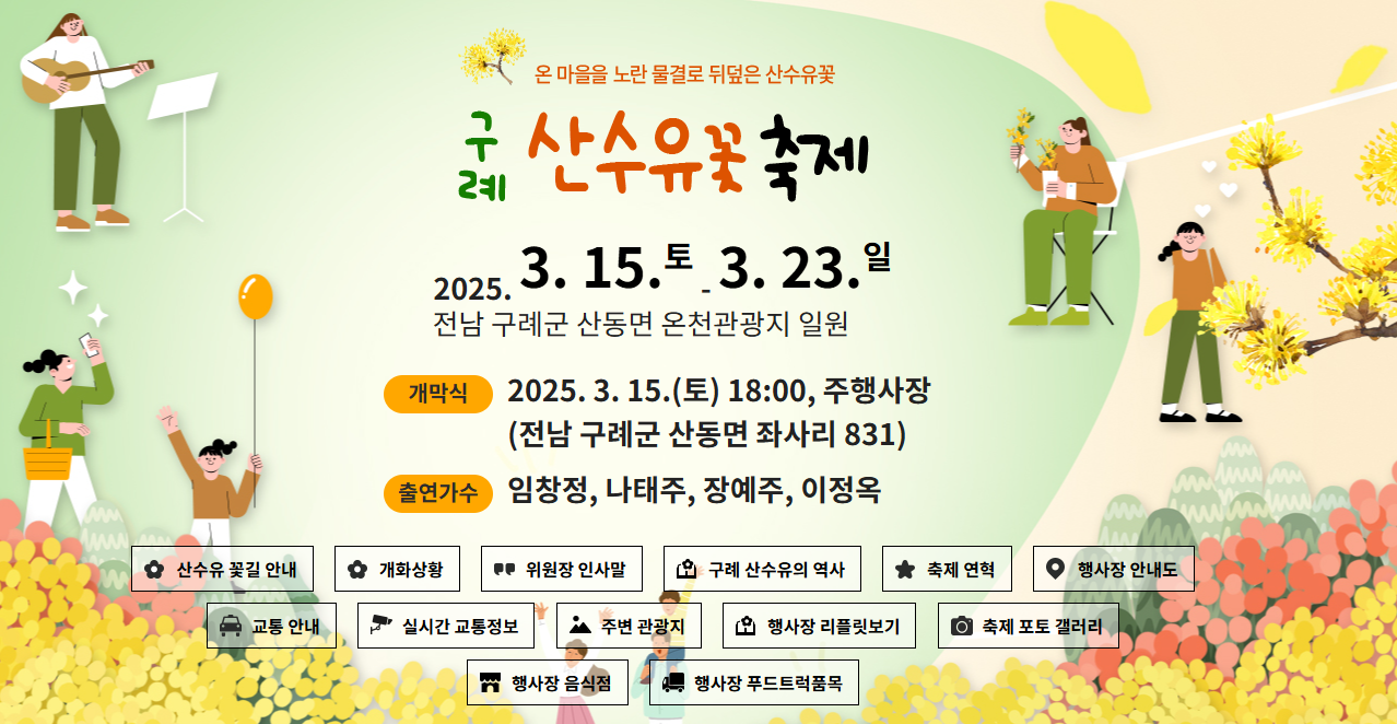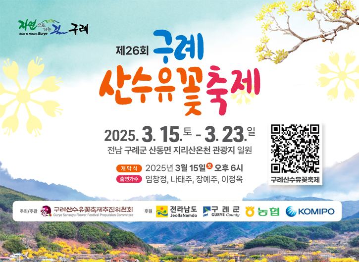 2025년 구례 산수유축제를 방문할 예정이신가요? **대중교통, 자차 이용법 & 주차장 정보**까지 한 번에 정리해드립니다!📆 2025년 구례 산수유축제 기본 정보 📅 **축제 기간:** 2025년 3월 16일(토) ~ 3월 24일(일)📍 **축제 장소:** 전라남도 구례군 산동면 일대 (구례 산수유마을)🎟️ **입장료:** 무료https://www.gurye.go.kr/🚆 대중교통으로 구례 산수유축제 가는 방법대중교통을 이용하면 **구례군 터미널이나 구례구역(기차역)에서 버스를 타고 이동**할 수 있습니다.✔ 기차 이용 시 (KTX & ITX-새마을, 무궁화호)🚉 **서울 출발:** KTX → 익산역 환승 → 구례구역 (약 2시간 30분 소요)🚉 **부산 출발:** KTX → 순천역 환승 ..