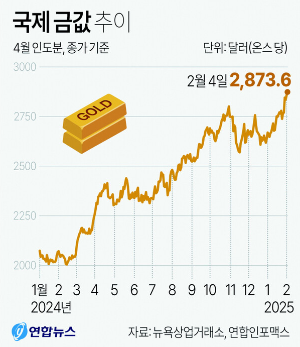 - 2025년 2월 10일 기준 온스당 2,911.30달러로, 1월 대비 큰 폭으로 상승하다가 최근 일부 조정을 보였습니다.