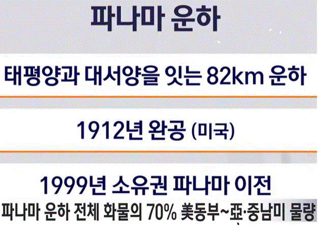 "파나마 운하는 파나마(PANAMA) 나라에 있는 운하입니다. 대서양과 태평양을 연결하는 약 82km 파나마 내해입니다. 그런데 남의 나라에 있는 운하를 우리가 뺏어오겠다. 환수라고 표현을 리턴이라는 표현을 썼습니다. 자 이 대목에 대해서 미국과 파나마 운하의 관계를 깊이 들여다보지 않으면 아 이것은 어떤 주권 침해 아니냐 이렇게 단순 생각을 할 수도 있고 트럼프가 그냥 해보는 말일 것이야라고 판단할 수도 있습니다. 그러나 자 파나마 운하의 역사 그리고 미국 경제의 구조를 볼 때, 트럼프 대통령의 파나마 운하 반환은 상당한 의지가 실린 실현 가능성이 높다 심지어 군대까지 동원할 수도 있다고 그러잖습니까? 자 파나마 운하는 원래 미국이 만든 거예요. 1910년 단순하게 미국이 만든 게 아니고요. 그게 파나마 운하가 있던 자리가 콜롬비아 땅이었는데. 콜롬비아 남부에 파나마 분리 독립주의자들이 독립운동을 하고 있었거든요. 그 사람들