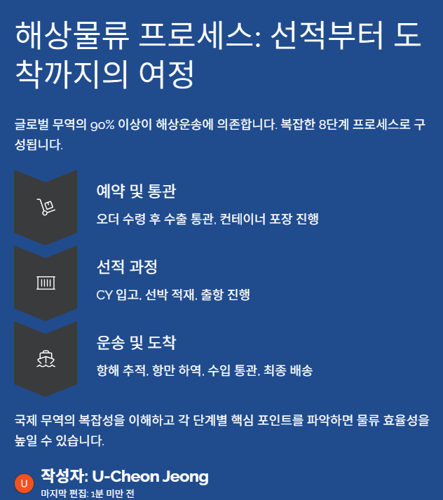 해상물류는 글로벌 공급망의 핵심입니다. 수출입 업무를 수행하는 기업, 무역업 종사자, 물류 담당자라면 해상운송의 전체 프로세스를 정확히 이해하는 것이 중요합니다. 본 글에서는 해상물류의 전체 흐름을 출발지에서 목적지까지 단계별로 정리해 드립니다.