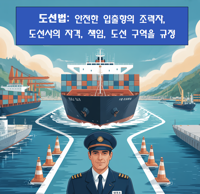 도선법은 항만 출입시 선박의 안전을 책임지는 도선사의 자격, 책임, 도선 구역을 규정합니다. 대형 선박의 안전 입출항에 필수적인 법률로, 조종성능과 항로 환경을 종합적으로 고려합니다.