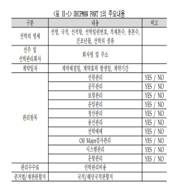 발틱 국제해운회의소(BIMCO)에서 작성한 선박관리 표준계약서식의 수탁관리업무 영역은 선택적 방식을 취하고 있으며, 주요 내용은 PART 1 및 PART 2로 되어있다.
